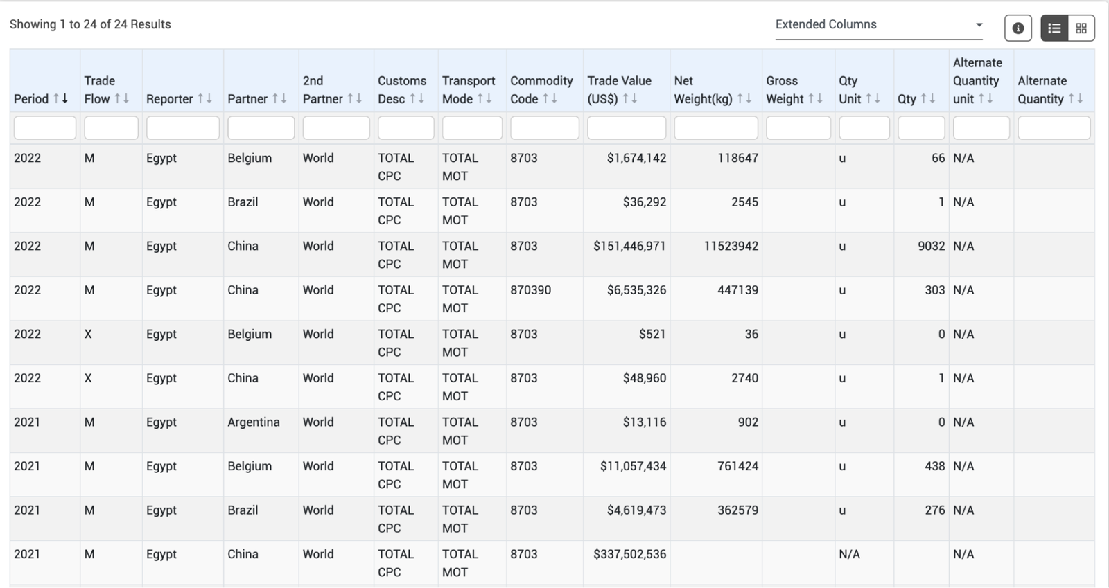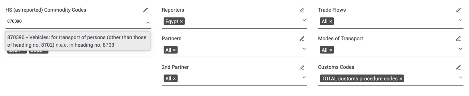 لإجراء بحث، يتعيّن عليك البحث عن رمز النظام المنسق (HS) للسلعة التي تهمك. هذه الرموز جزء من نظام دولي لتصنيف التجارة رقميًا، وهي عادة ما تكون سهلة العثور. على سبيل المثال، إذا أردت البحث عن استيراد مصر من السيارات منذ عام ٢٠٢٢ فستحتاج إلى رمز النظام المنسق 870390. لإيجاد هذا الرمز، ما عليك سوى البحث في Google عن “رمز النظام المنسق للسيارات”.