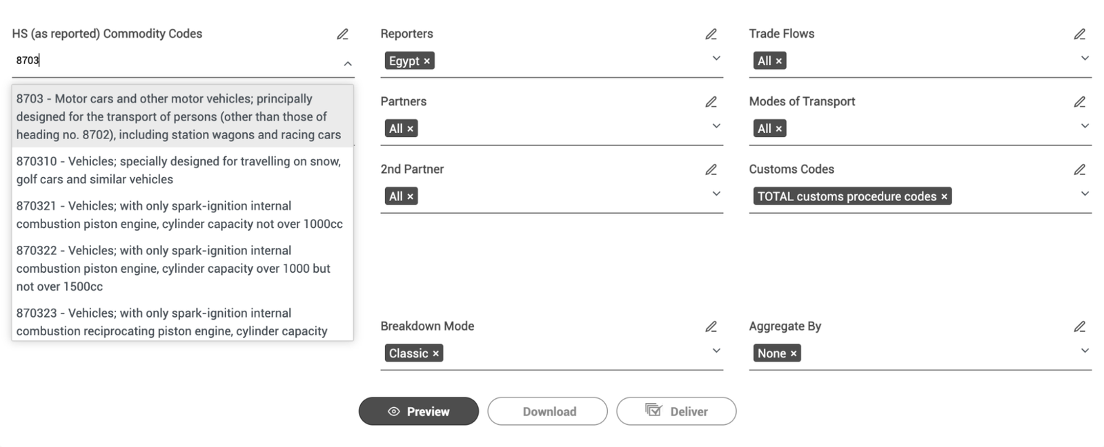 تذكّر أن التقارير على مستوى الدول ليست دائمًا دقيقة. إذا لم تجد أي بيانات لرمز النظام المنسق المكون من ستة أرقام، فقد يكون من المفيد إجراء بحث عن رمز السلعة الأكثر عمومية والمكون من أربعة أرقام، الذي تستخدمه السلطات أحيانًا بدلاً من ذلك. بالنسبة للسيارات، سيكون ذلك 8703 وتستخدمه السلطات ليشمل محركات السيارات، والعربات، والدراجات النارية.