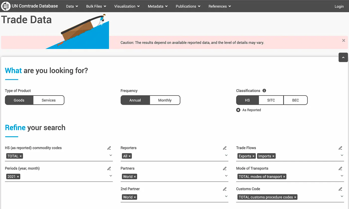 ولبدء استخدامها توجه للموقع وانقر على عبارة “التجارة- Trade” تحت علامة تبويب “البيانات- Data” في الأعلى، واستخدم مصفوفة البحث لطلب معلومات عن السلع المستوردة أو المصدرة من الدول ذات الاهتمام خلال سنوات معيّنة. المصفوفة سهلة الاستخدام؛ استخدم القوائم المنسدلة لتحديد الدول، وشركائها التجاريين، والسلع ذات الاهتمام.