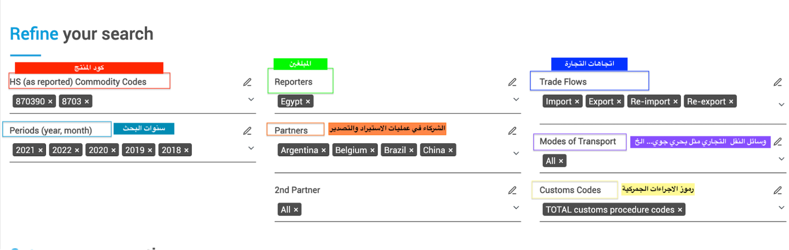 بعد أن قمنا باختيار رمز المنتج يجب أن نقوم بعملية تصفية البيانات وفقاً للمعلومات التي نبحث عنها: اختر السنوات (أقصى حد 5) المبلغين (أقصى حد 5) والشركاء (أقصى حد 5) واتجاهات التجارة (الواردات والصادرات وإعادة الواردات وإعادة الصادرات).